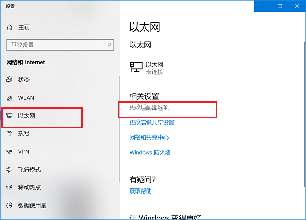 如图,在界面左侧点击【以太网】,然后点击【更改适配器选项】,