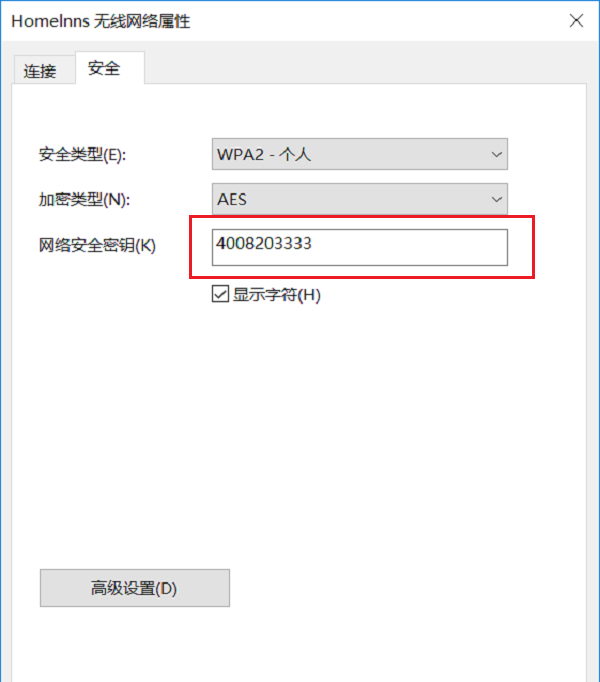 如图,点击【安全】,网络安全密钥就是WiFi密码,勾选【显示字符】,