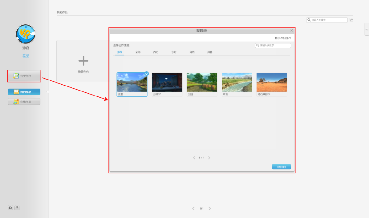 先选择创作主题,或者在搜索栏中输入关键字、找到你想要的主题场景,选好之后,点击【开始创作】,