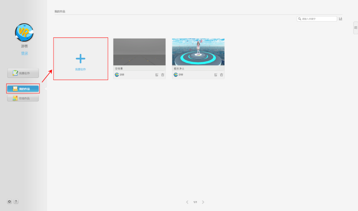 打开101创想世界,登录账号,进入主界面,如果你想要创建一个属于自己的作品,可以点击界面左侧的【我要创作】按钮,如图,