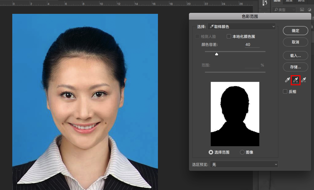 在菜单栏中点击【选择】——【色彩范围】命令,调出面板,选择带加号的吸管工具,在蓝色背景上一直单击,这里可以调节容差参数,用来控制吸管对颜色的识别度(参数越小、识别度越高),