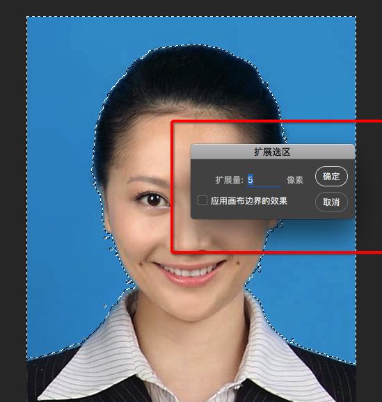在菜单栏中点击【选择】——【修改】——【扩展】,弹出对话框,扩展5个像素即可,