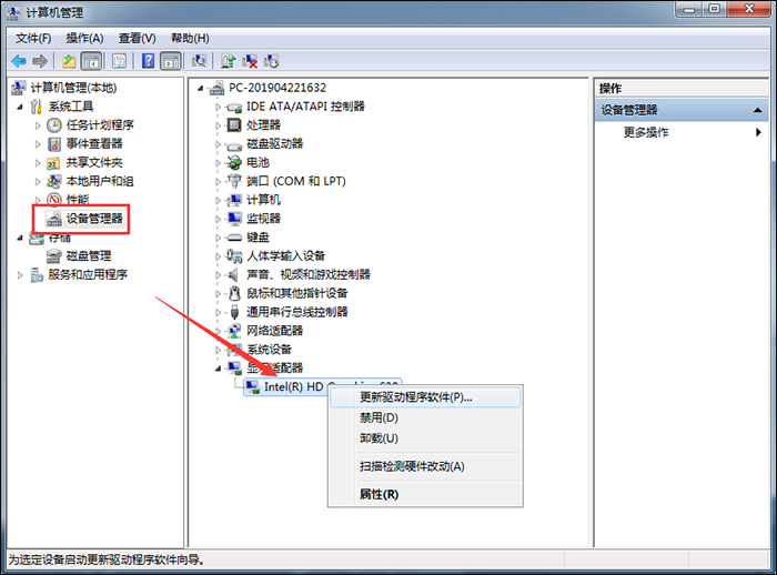 进入计算机管理界面,点击【设备管理器】——【显示适配器】,鼠标右击适配器上,点击【更新驱动程序软件】,
