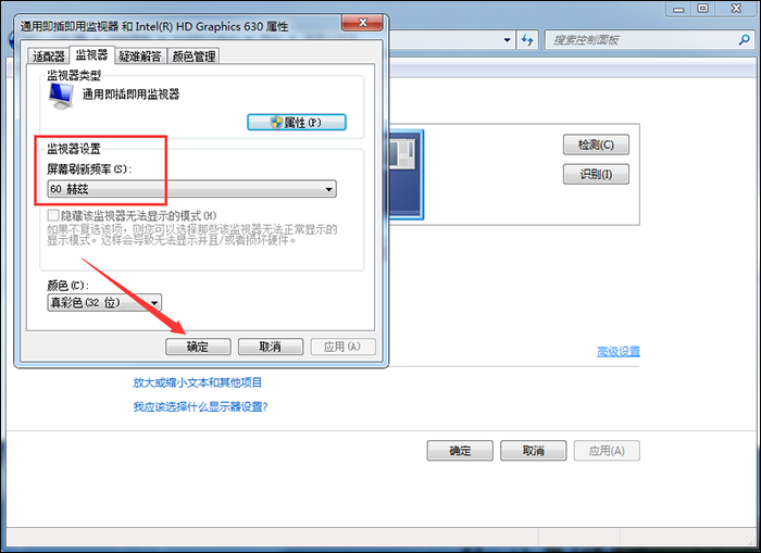 进入属性界面,切换至【监视器】页面,然后点击【监视器设置】——【屏幕刷新频率】,进行调整,最后点击确定。