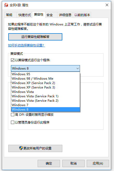 在桌面右击全民K歌软件图标,选择【属性】,打开窗口,点击【兼容性】——【以兼容模式运行这个程序】,勾选该选项,点击下拉框,选择你所使用的电脑系统,最后点击【应用】——【确定】即可。