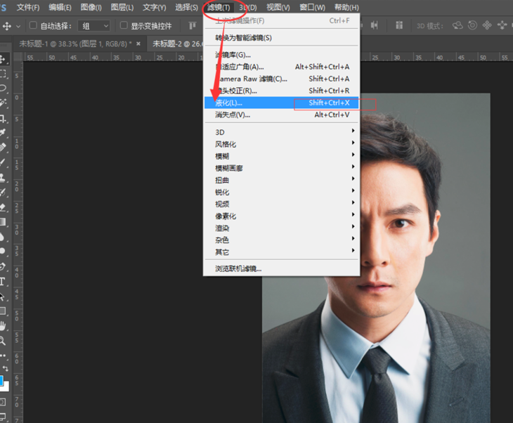 在菜单栏中点击【滤镜】——【液化】,或者按快捷键【shift+ctrl+X】,