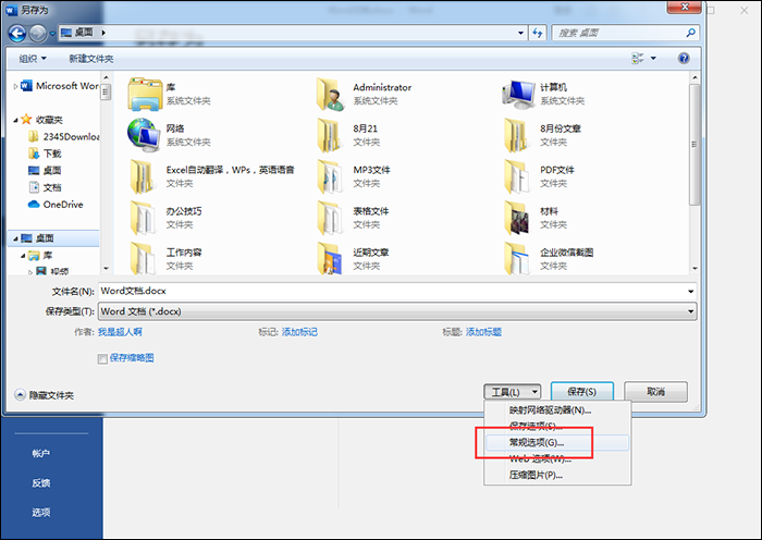 1、打开Word文档,在菜单栏中点击【文件】——【另存为】,弹出窗口,如图,选择保存在桌面,接着点击【工具】——【常规选项】,