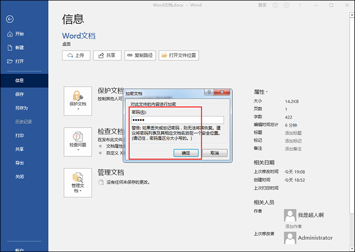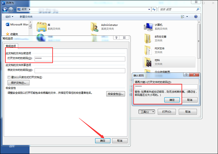 2、弹出加密文档对话框,输入密码,点击确定即可,然后在确认密码界面中再次输入密码,点击确定。