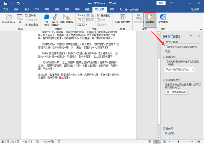 1、如图,在菜单栏中点击【开发工具】——【限制编辑】,然后勾选【限制对选定的样式设置格式】,
