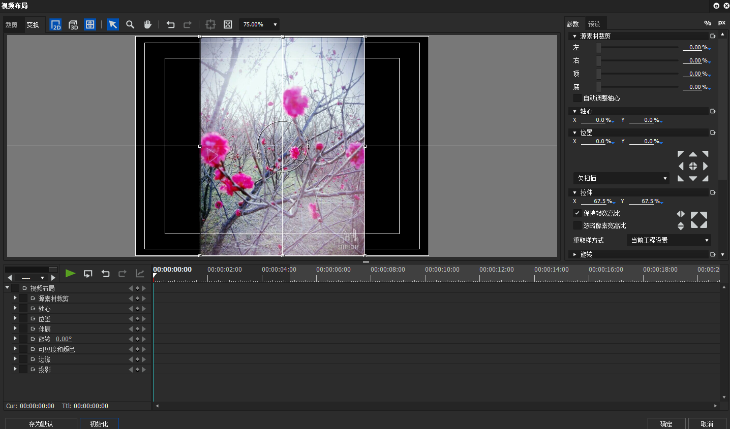 打开Edius软件,导入一张图片,先放到素材库,然后将其拖放至时间轴,按F7,打开视频布局,如图,