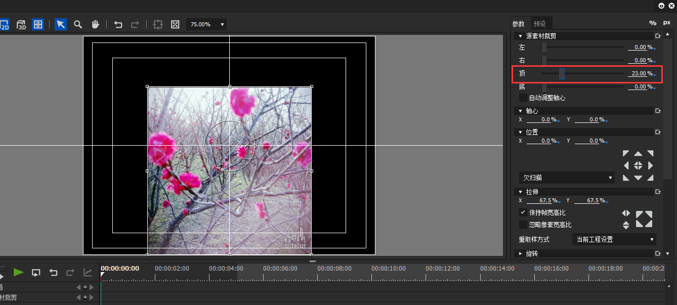 在界面右侧点击【参数】一栏,在【源素材裁剪】处即可裁剪图片,如图,裁剪图片上部分,发现图片高度变了,