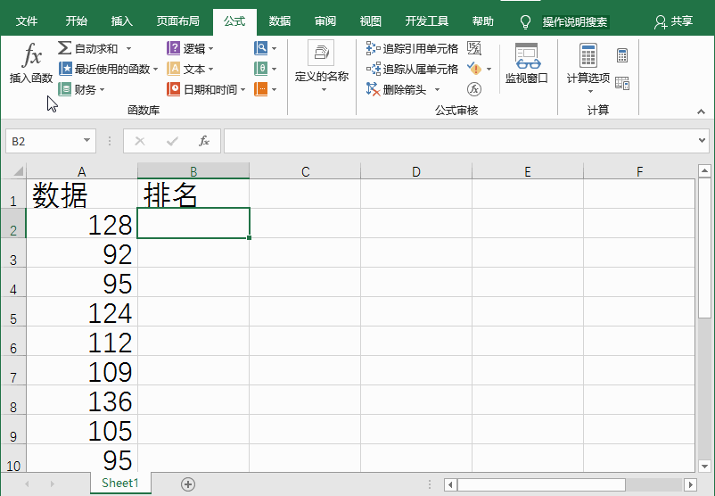 打开Excel表格,如图,在B2单元格中输入【=RANK(A2,$A$2:$A$10)】,按回车键,即可得出排名结果。