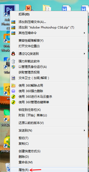如图,在电脑桌面上右击PS软件图标,弹出菜单,点击【属性】,