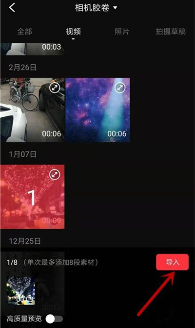 打开手机相册,选择视频文件,点击【导入】,