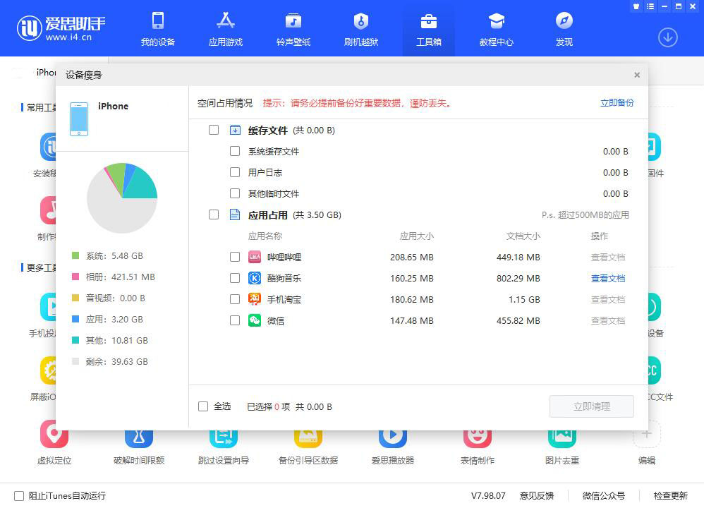 爱思助手PC版最新升级,将“清理设备垃圾”工具更名为“设备瘦身”,功能也越发强大,可以扫描出iPhone手机中的垃圾缓存文件和超过500MB的应用,帮助用户进行系统清理。