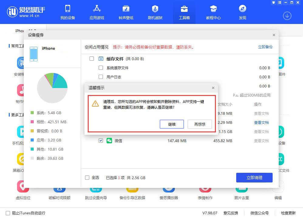 勾选需要清理的应用,出现提示,爱思助手会将应用以及应用数据全部删除,数据无法恢复,请大家一定要做好备份工作,