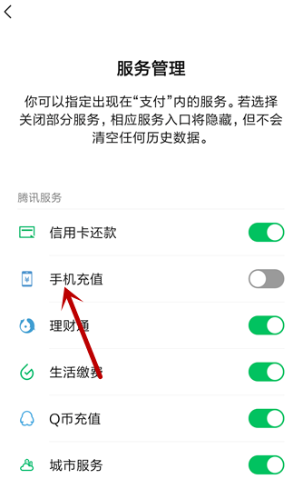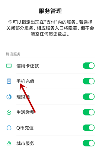 找到【手机充值】,该功能是关闭的,点击开启,