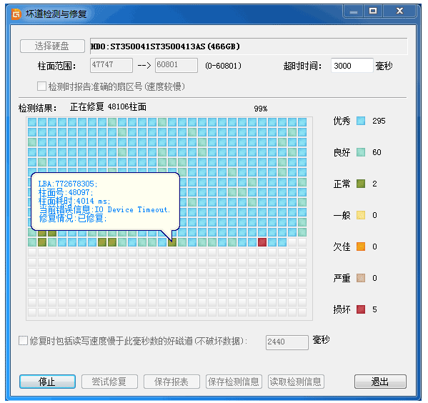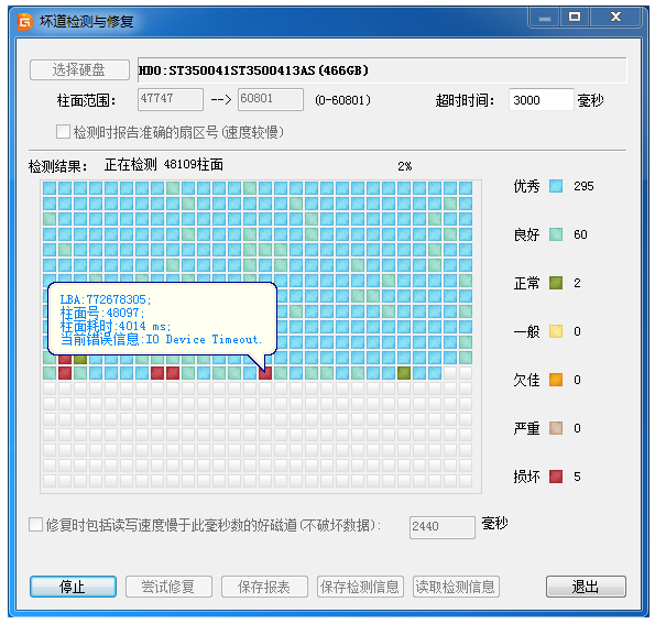 检测过程中遇到坏道,检测速度会变慢,检测完毕,软件报告检测到的坏道数目,