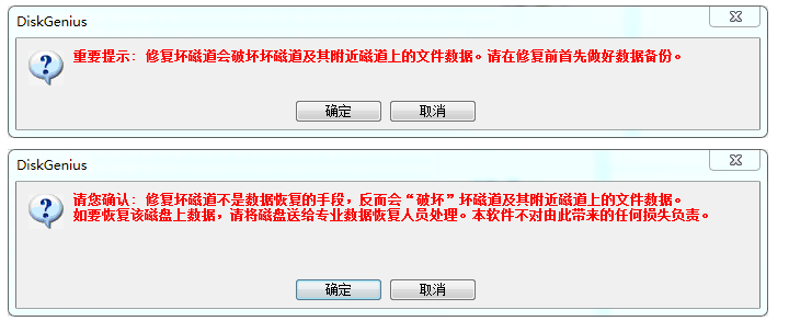 点击【尝试修复】按钮,软件会尝试修复刚刚检测到的坏道,并给出提示,如图,请先做好数据备份工作,