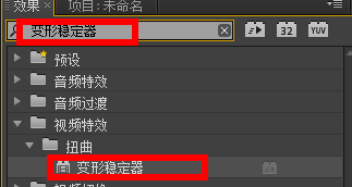 在界面上方点击【效果】,搜索并找到【变形稳定器】或者【wark】,如图,