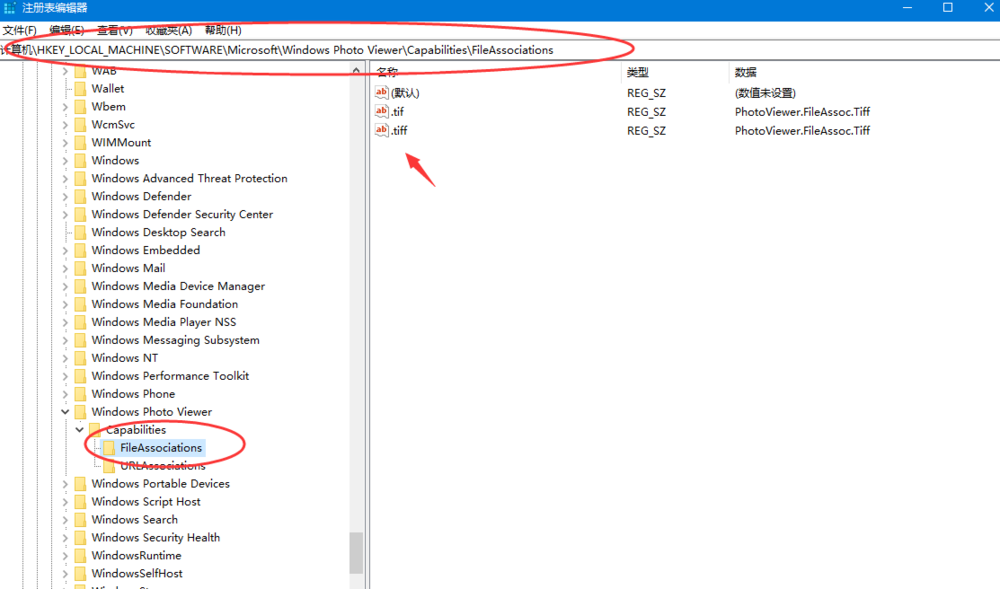 打开注册表,依次点击【HKEY_LOCAL_MACHINE\\SOFTWARE\\Microsoft\\Windows Photo Viewer\\Capabilities\\FileAssociations】,