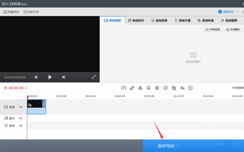 打开快剪辑软件,导入视频素材,进行简单处理,如图,现在需要导出保存,