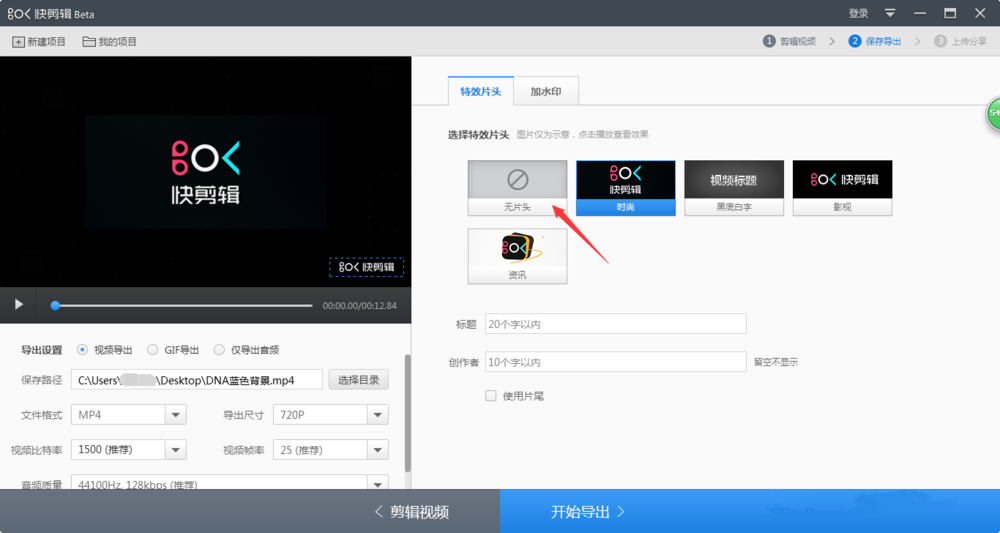 打开窗口,我们可以看到软件默认使用自带的片头,这里选择【无片头】,
