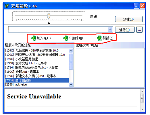 2、选择需要处理的进程,点击【加入】,即可出现在【速度改变的进程】窗口,拉动变速条,进行程序加速、加速处理,