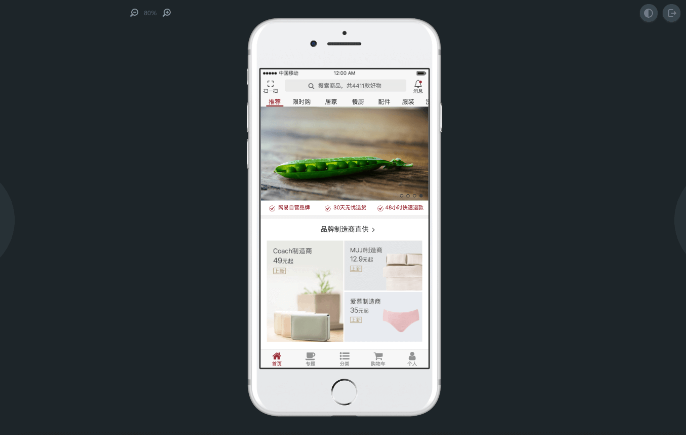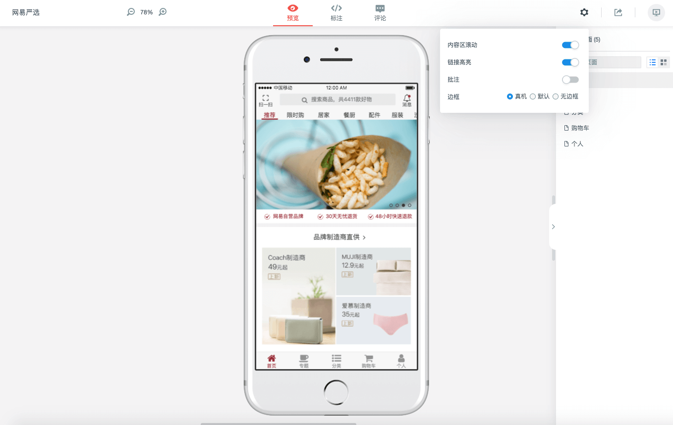 原型制作过程中,你可以随时查看原型在PC或移动设备上的真实运行效果,还可以将原型进行我来教你。在工作区点击【运行】按钮,即可进入原型演示模式;在【预览】页面,你还可以进行详细设置。例如原型是否带真机外壳、是否显示批注等等,