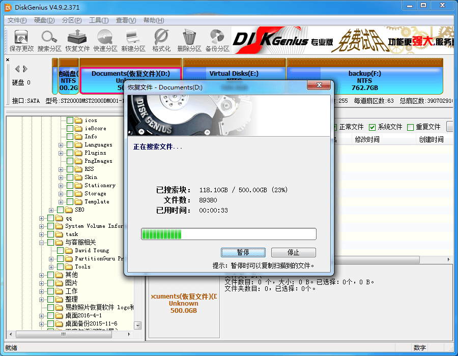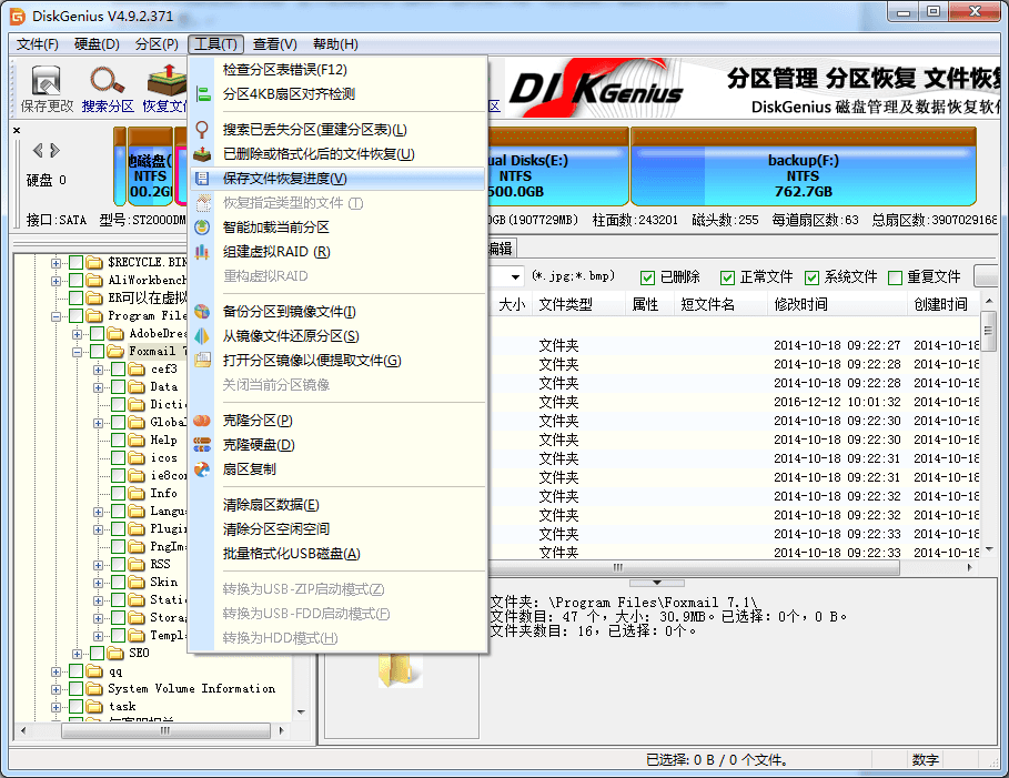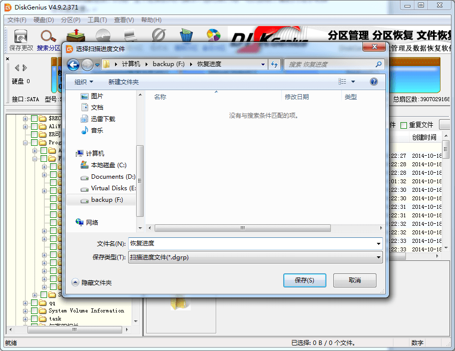 需要注意的是,DiskGenius在搜索恢复文件的时候会自动保存进度,但是,如果本软件位于扫描区域,它不会自动保存扫描进度,所以用户必须手动保存恢复进度。