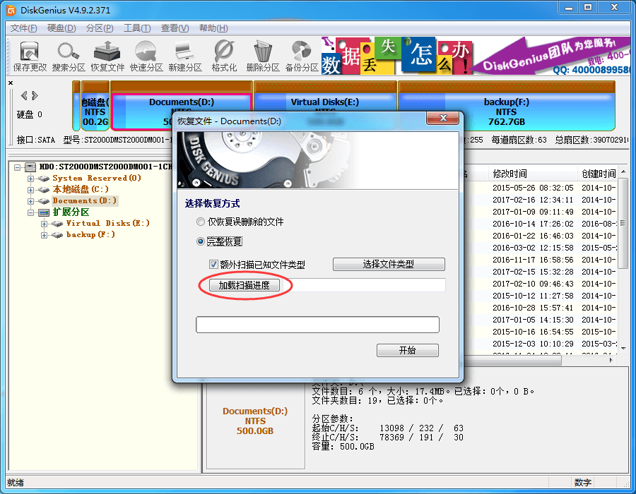 打开DiskGenius,选中之前扫描并保存过恢复进度的分区,然后点击【恢复文件】,弹出窗口,点击【加载扫描进度】,