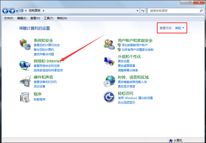 1、打开控制面板,设置【查看方式】为类别,如图,点击【网络和Internet】选项,