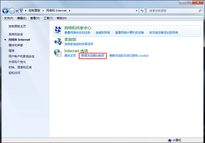2、进入以下界面,点击【Internet选项】——【管理浏览器加载项】,