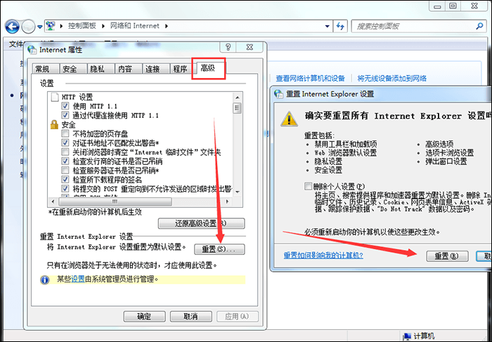 3、打开Internet属性窗口,然后点击【高级】——【重置】,弹出对话框,点击【重置】即可。