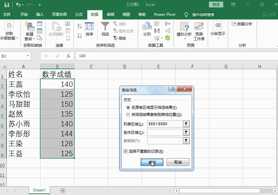 2、打开高级筛选对话框,选择方式为【在原有区域选择筛选结果】,选择列表区域,勾选【选择不重复记录】,点击确定就可以了。