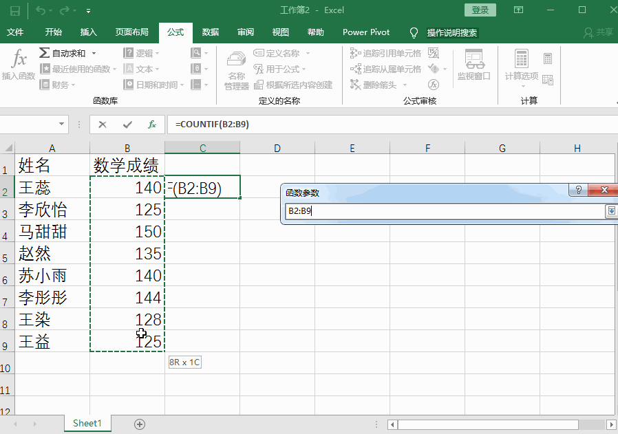 选中C2单元格,在菜单栏中点击【公式】——【插入函数】,找到Countif函数,点击确定;打开函数参数对话框,根据下图演示进行操作,点击确定,得出结果,然后下拉C2单元格,数字2说明有重复值,数字1说明没有重复值。