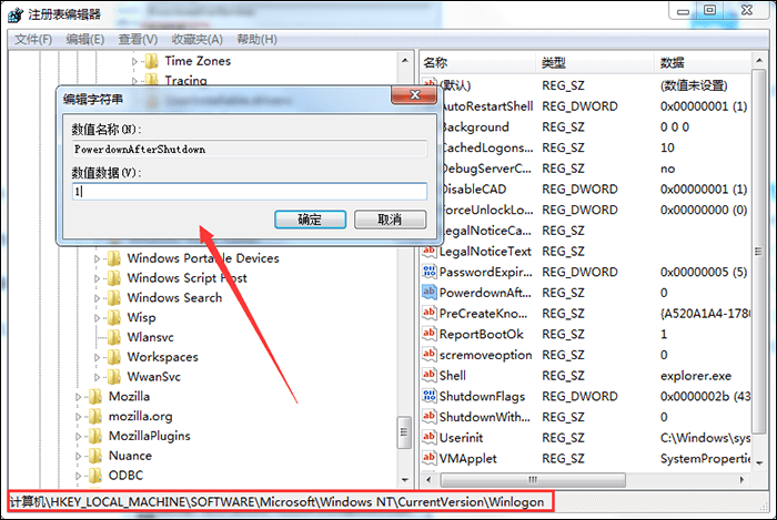 2、打开注册表编辑器,依次点击HKEY_LOCAL_MACHINE\\SOFTWARE\\Microsoft\\Windows NT\\CurrentVersion\\Winlogons,右击PowerdownAfterShutdown,修改其数值数据为1,点击确定即可。