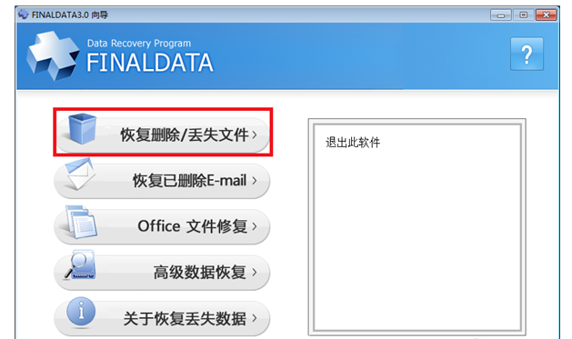 打开finaldata软件,进入界面,选择【恢复删除/丢失文件】功能,