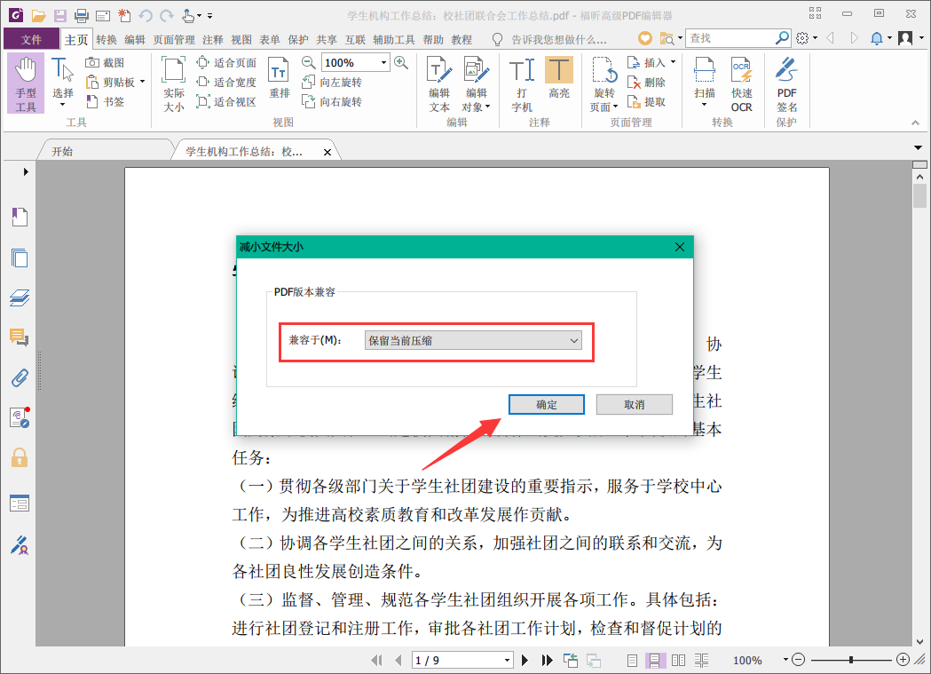 3、弹出【减小文件大小】对话窗,选择PDF版本兼容,默认保留当前压缩,之后点击确定,