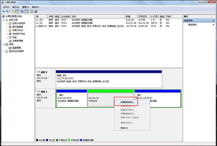 4、如图,页面中会出现一个绿色的可用空间,选中它,鼠标右击,点击【新建简单卷】,