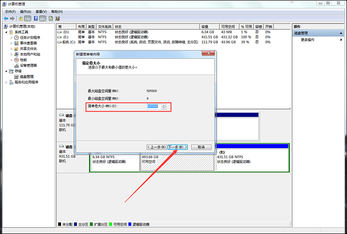 5、打开新建简单卷向导,设置简单卷大小,点击下一步,