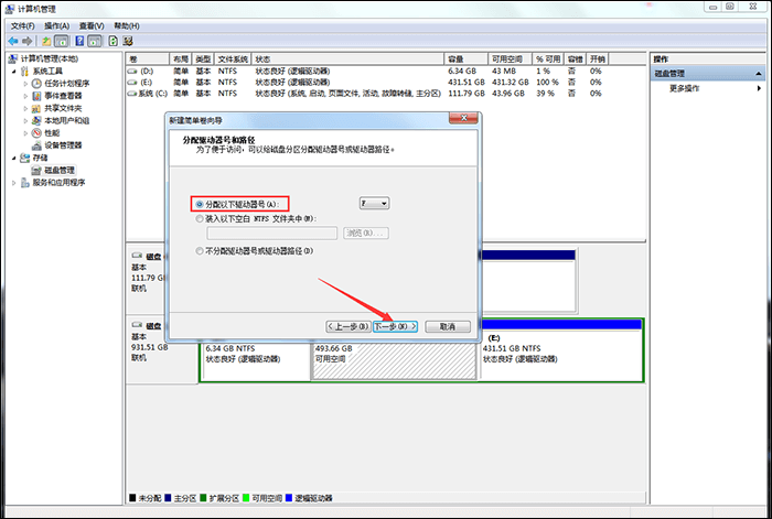 6、接着勾选【分配以下驱动器号】,继续下一步,