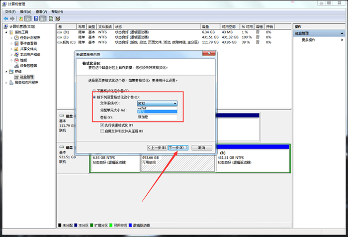 7、进行格式化分区,选择【文件系统】为NTFS,勾选【执行快速格式化】,点击下一步,