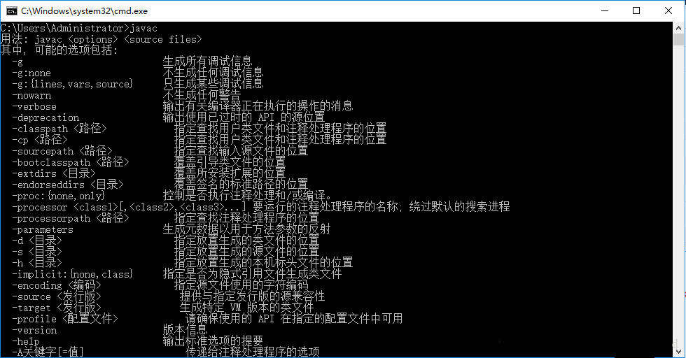 此时打开dos命令,输入javac,即可测试配置成功,