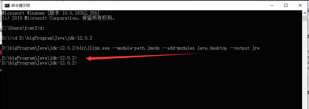 输入命令:bin\\jlink.exe --module-path jmods --add-modules java.desktop --output jre,回车,