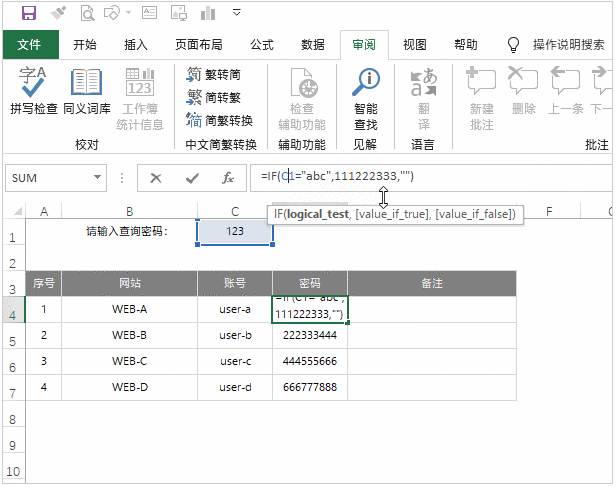 3. 为第一个密码单元格(本例为D4)添加公式,格式为“=IF(C1=”abc”,111222333,””)”;