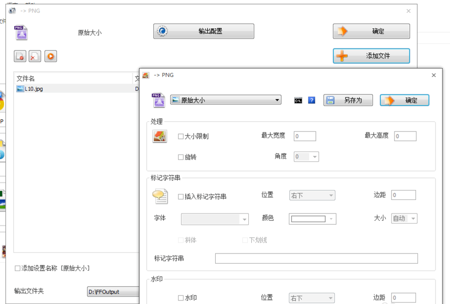 导入图片之后,点击【输出配置】,设置图片尺寸大小、另存位置等等,如图,