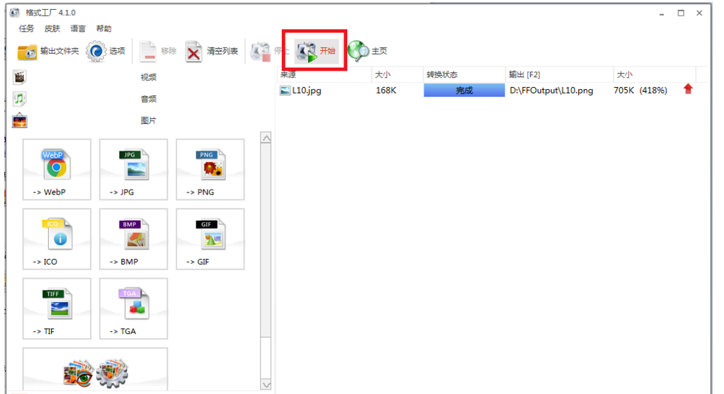 回到主页,点击【开始】,软件开始转换图片格式,稍等,
