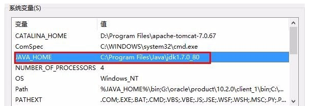 弹出窗口,点击【系统变量】,找到JAVA_HOME变量,如果没有,就找Path变量,点击【编辑】,打开对话框,在【变量值】中输入JDK1.7的安装路径,如图,