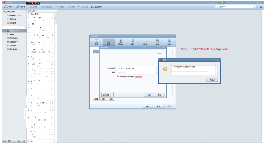 如果创建失败,点击【查看详情】,根据提示进行操作,这里出现的警告是【您没有权限使用pop3功能】,说明我的邮箱没有启用pop3服务,